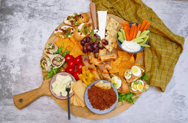 Maak deze zomerse borrelplank af met een stuk brie, tortillachips, rauwkost naar keuze en toastjes.