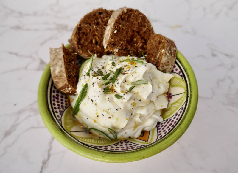 | 4. Meng de geitenkaas met de roomkaas, knoflook, citroenrasp en basilicum en doe in een ovenbestendig schaaltje. | |