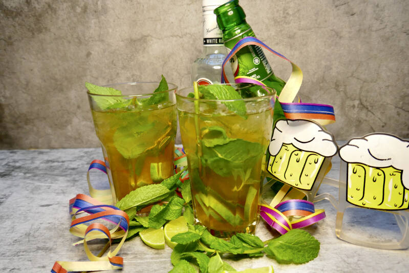 | 2. Verdeel de limoenschijfjes over de glazen met de pils, het limoensap, de witte rum, spa rood en bruine suiker. Meng het geheel goed. | |