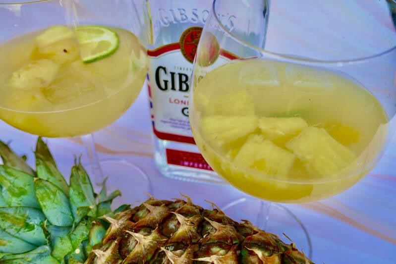 | 1. Verdeel de tonic, gin en ananassap over 2 glazen. | |