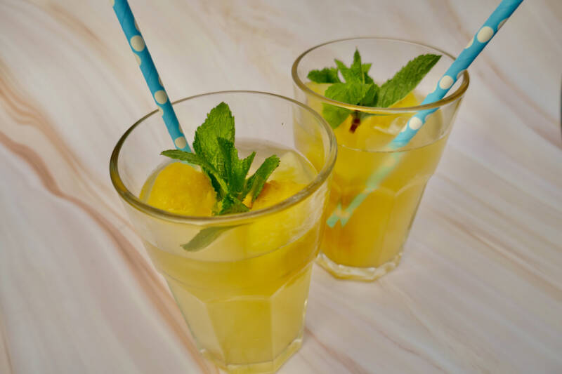 | 3. Vul de glazen met ijsblokjes en verdeel de cocktail over de glazen. Maak af met de takjes munt. |
