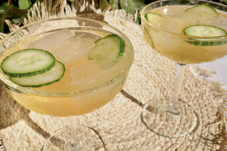 | 3. Verdeel vervolgens de licor 43, spa rood en komkommer. Maak af met ijsblokjes. |