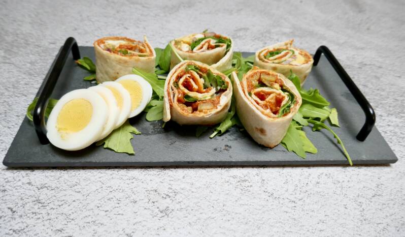| 4. Beleg de wrap met ui, augurk, kappertjes, rucola en plakjes ei. | |