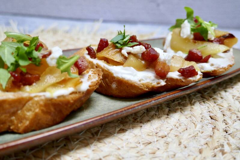 | 10. Maak het broodje af met de gekaramelliseerde peer en gebakken spekjes. |
