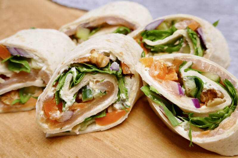 | 2. Besmeer de wraps met de roomkaas. Verdeel vervolgens de gerookte zalm, ui, paprika en rucola over de wraps. Breng op smaak met peper en zout. | |