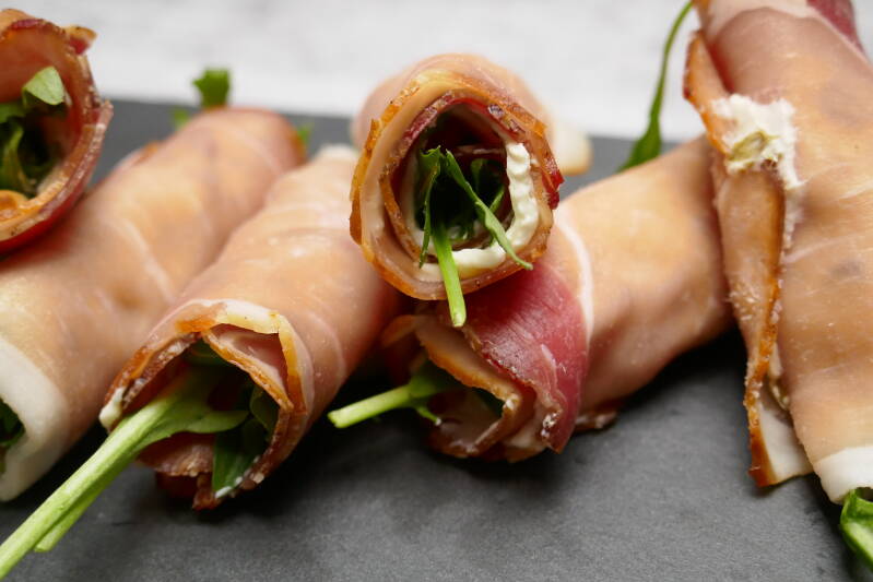 | 2. Besmeer de plakken rauwe ham met de roomkaas. Verdeel hier vervolgens de pijnboompitten en rucola over. Breng op smaak met peper en zout. | |