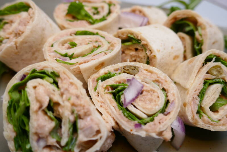 | 3. Besmeer de wraps met de tonijnsalade. Verdeel hier vervolgens de rucola overheen. | |