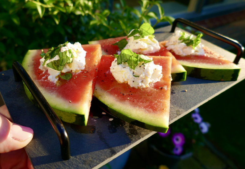 | 2. Verdeel de ricotta over de watermeloen. Maak af met de fijngehakte basilicumblaadjes. | |