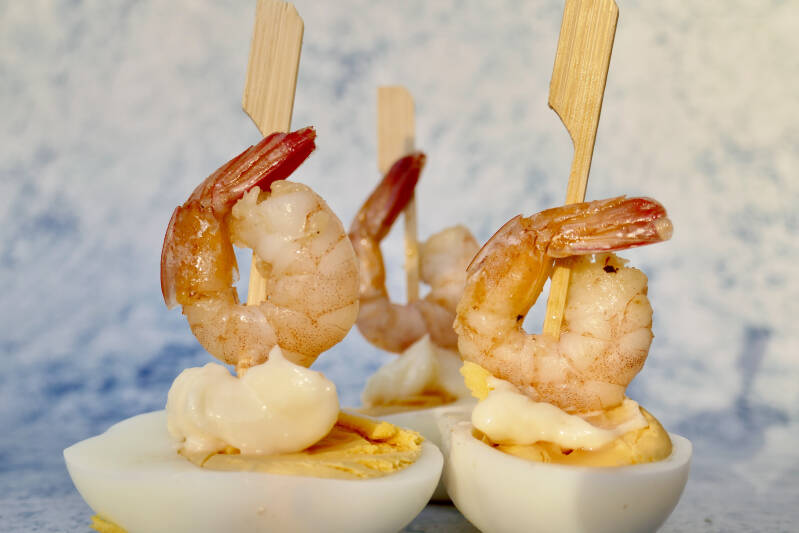 | 5. Rijg de garnalen aan een cocktailprikker. Maak af met het gekookte eitje. |