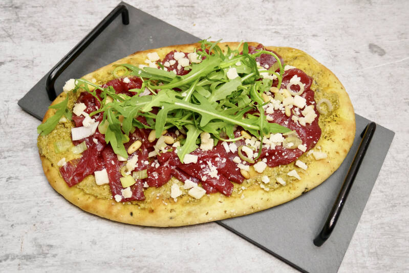 | 3. Besmeer de naanbroodjes met de pesto. Verdeel hier vervolgens de carpaccio over. Breng op smaak met peper en zout. | |