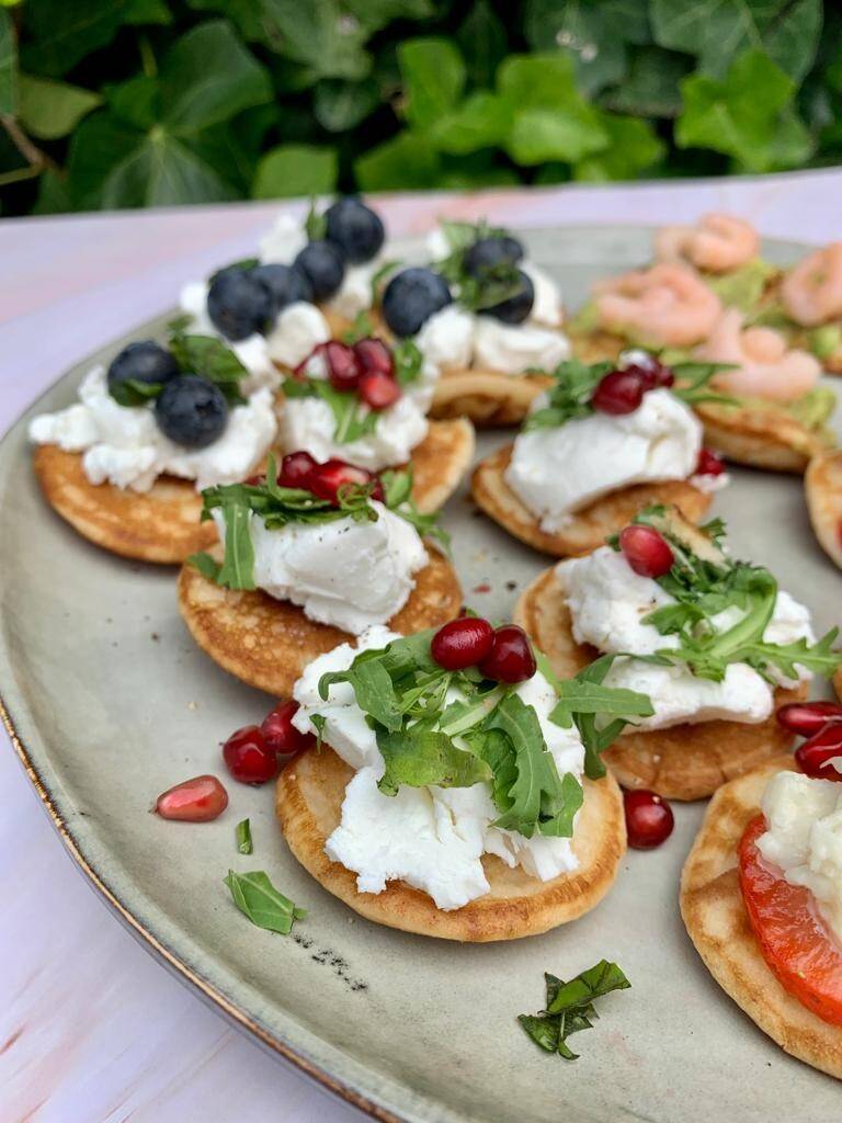 | 2. Verdeel de geitenkaas over de poffertjes. Maak af met de granaatappelpitjes en rucola. |