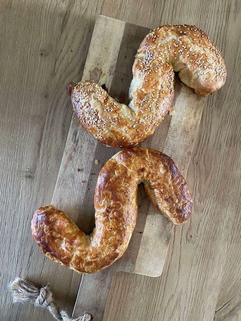 | 4. Snijd het bladerdeeg door midden. Leg in het middelste gedeelte het gehaktmengsel. Vouw het bladerdeeg dicht en draai het om. Vorm hier vervolgens een letter van. | |