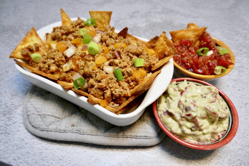 | 5. Doe de tortillachips in een ovenschaal en verdeel het gehaktmengsel erover. | |