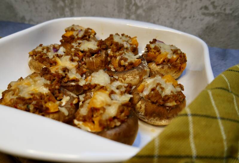 | 6. Smeer de binnnenkant van de champignon in met crème fraîche. Vervolgens verdeel je het gehaktmengsel erover. Eindig met de geraspte kaas. | |