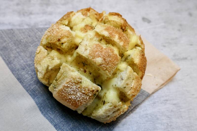 | 2. Snijd de Italiaanse bol één keer in de lengte en 4 keer in de breedte, zodat er 10 vierkantjes ontstaan. Zorg ervoor dat het brood niet volledig doorgesneden wordt. | |