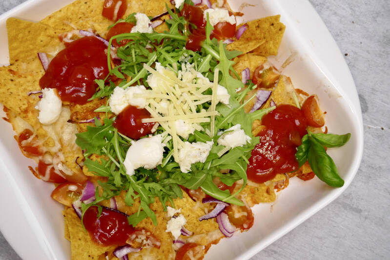 | 3. Doe de tortillachips in een ovenschaal. Verdeel vervolgens de ui, cherrytomaat en geraspte mozzarella erover. | |
