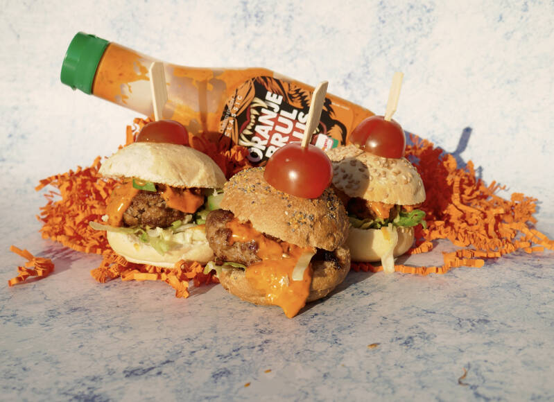 | 4. Snijd de broodjes open. Verdeel hierover de hamburgers, ijsbergsla, komkommer en oranje brulsaus. | |
