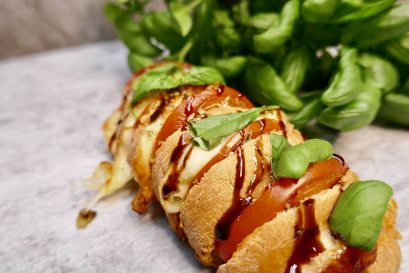| 7. Snijd ondertussen de basilicumblaadjes fijn. Verdeel deze over de ciabatta samen met de balsamico. |